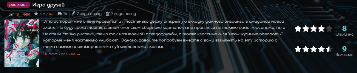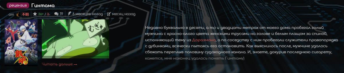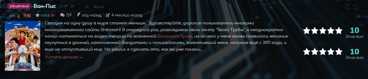 В 2013 году благодаря сестре я создал аккаунт на данном сайте. Здесь было удобно фильтровать список просмотренного добра. Но аккаунт этот прожил недолго, из-за чего в 2017 году пришлось создать новый. Удобный плеер подогревал желание смотреть аниме, а дружелюбное комьюнити подогревало не только мою жопу, но и страсть. Сейчас сайт переживает свои самые худшие года, и, надеюсь, сможет вернуть себе былую ламповость, из-за которой я когда-то сюда пришел».