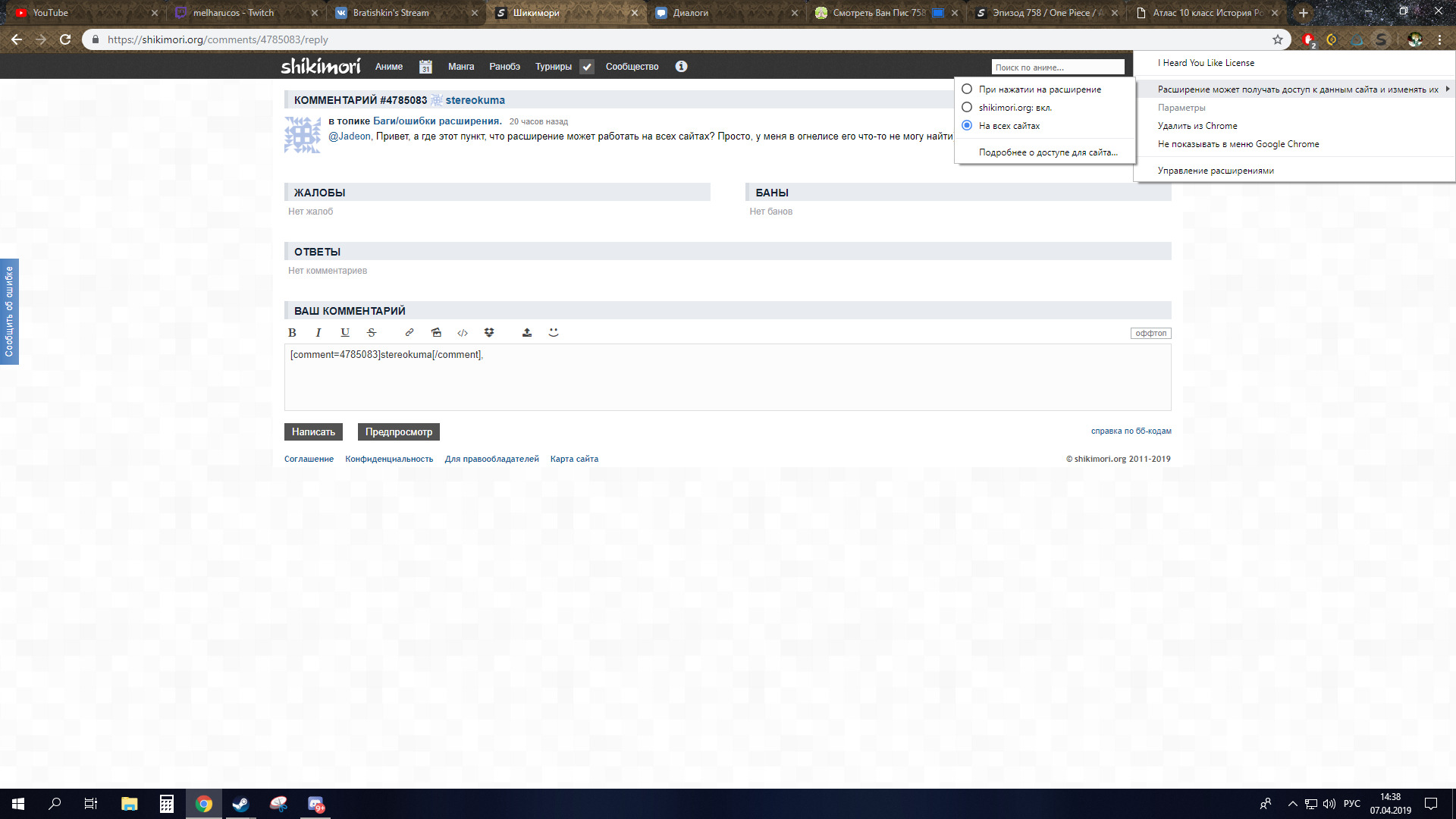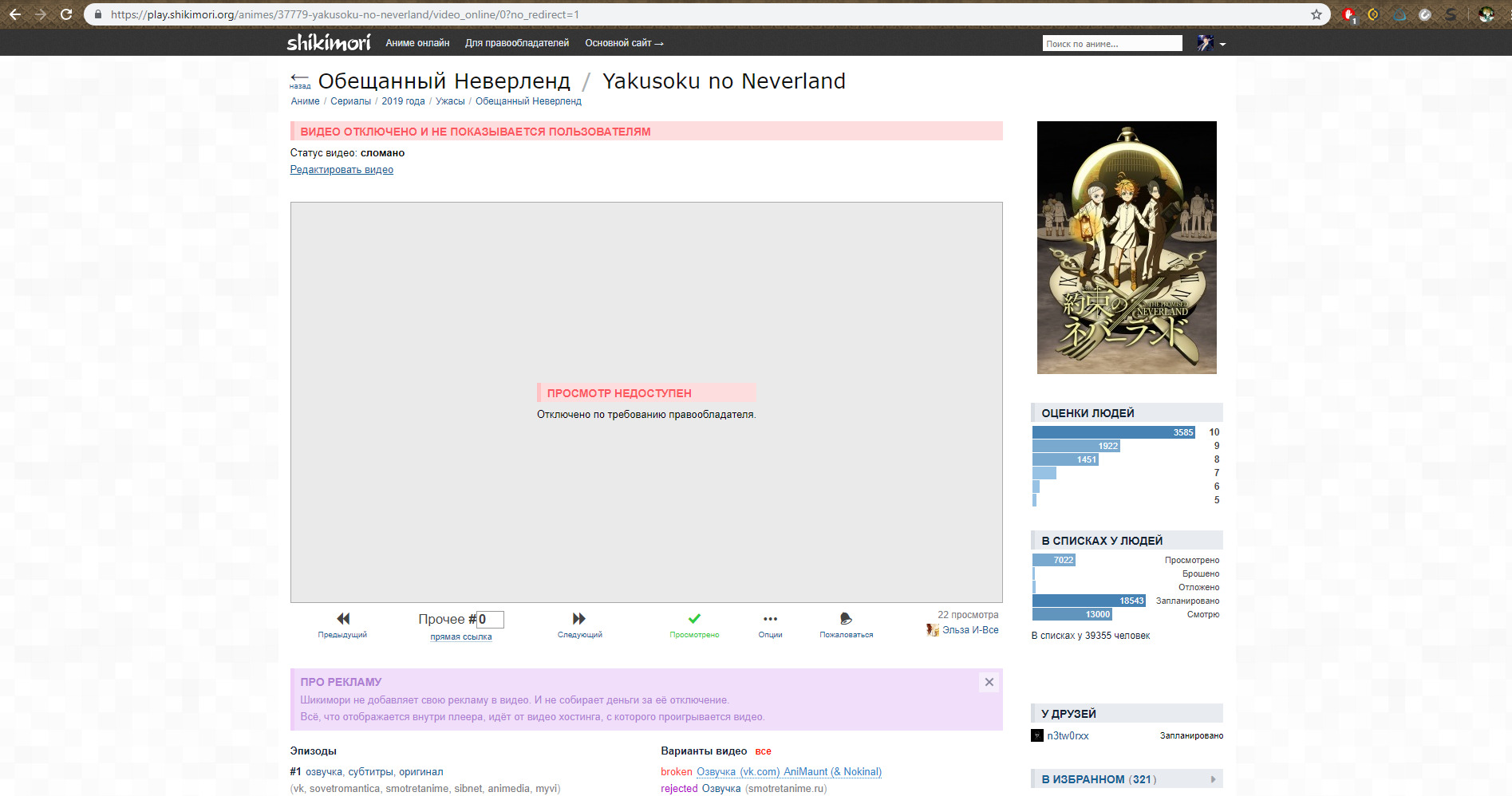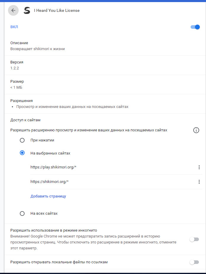 @Skapershik, Огромное спасибо Вам за помощь!!! Второй способ как раз помог!@Skapershik@Вячеслав Суркин,@Skapershik, Дай бог здоровья)@Jadeon@Jadeon, Это после того, как я последовал указаниям выше, про нулевой эпизод.@ThePrincessOf69@Jadeon, ссылка должна содержать ?no_redirect=1 в конце, иначе расширение не срабатывает. То, что у тебя на скрине, это плеер шикимори (понять это можно, например, по фиолетовой плашке), а не расширения, соответственно, он и не работает. Поэтому предполагаю, что у тебя этого нет.@Jadeon@ThePrincessOf69,@ThePrincessOf69@Jadeon, какая версия расширения у тебя?@Jadeon@ThePrincessOf69, Последняя@Skapershik@Jadeon, Делай скрин консоли (F12 -> Console) на странице с проблемным тайтлом, будем разбираться 8)@Jadeon@Skapershik,@Skapershik@Jadeon, судя по скрину скрипт расширения просто не работает, почему-то он не видит, что тайтл лицензирован. Стоят какие-нибудь еще расширения? Может что-то конфликтует...@Jadeon,@Jadeon@Skapershik,@Jadeon@Jadeon, это 2 эпизод@Skapershik, Проблема решилась, когда выбрал пункт, что расширение может работать на всех сайтах. Но в поисковой строке цифру 0 на 1 все равно приходится менять.@ThePrincessOf69@Jadeon, а как так получилось, что у тебя эта настройка стояла?@Jadeon@ThePrincessOf69, Стояло, что включено только на шикимори. С этой настройкой не работает, я ее сам ставил, чтоб лишний раз ничего не грузило.@ThePrincessOf69,@Propylene@Jadeon, видимо, в итоге, браузер посчитал что play.shikimori и shikimori это разные сайты и на странице с просмотром не запустил расширение нормально.@Jadeon, Привет, а где этот пункт, что расширение может работать на всех сайтах? Просто, у меня в огнелисе его что-то не могу найти)@Jadeon@stereokuma,