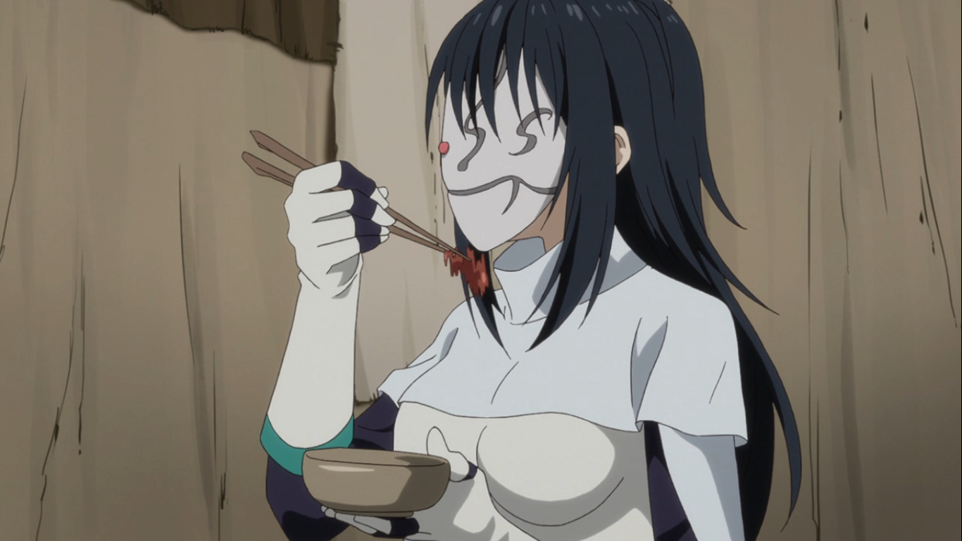 В одной серии нас даже пытаются ввести в заблуждение, указывая на якобы различие в повадках иномирки Шизу и местных авантюристов (сравните их позу и то, как они держат палочки):