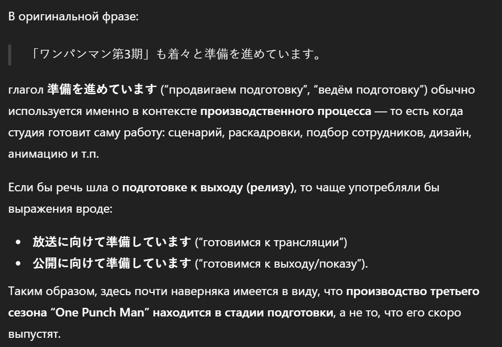 Кроме того, хотя до выхода третьего сезона сериала «One Punch Man» еще далеко, мы уже вовсю готовимся к нему.Он цепляется за слово preparation (junbi) и начинает трактовать его как pre-production. То есть слова продюсера: Мы готовимся к выходу 3 сезона, он переделал в: Мы готовимся начать производство 3 сезона. О чем тут вообще можно говорить.