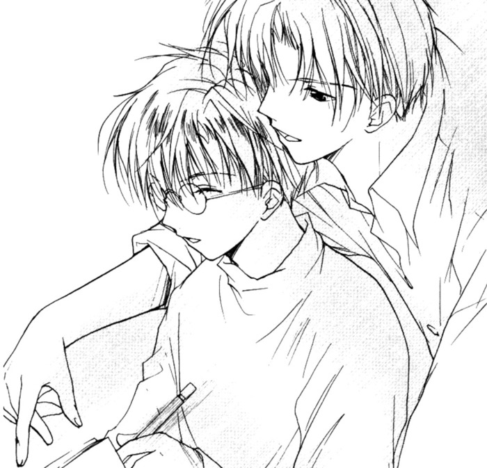 Кстати о самих героях. Главная пара понравилась очень. Как бы мангака ни чудила, но каким-то образом ей удалось создать довольно реалистичные интересные крепкие и нежные отношения. Шуичи, который раньше обожал только музыку, оказался просто моментально привлечён Эйри Юки. Конечно, большую роль в этом толчке сыграла их первая встреча - яркая внешность Юки, первая критика. Зацепил сразу, и чем больше Шуичи гонялся за ним, тем больше сам же во всём этом и тонул. У него как будто переключатель щёлкнул - бац! - интерес, решение - и всё, Шиндо уже не остановить, он решил для себя любить Юки, он влюбился в Юки, он теперь за ним на край света пойдёт. Как ни странно, но это не выглядело надуманно. Мне наоборот показалось реалистичным, ведь бывает же, что ты встречаешь человека и сразу испытываешь к нему симпатию? По-любому испытываешь либо симпатию, либо неприязнь. А Шуичи сомневался только из-за грубых комментариев Юки - они задели его самолюбие. Когда же он узнал Юки чуть получше, это прошло, точнее, он просто привык к его натуре.