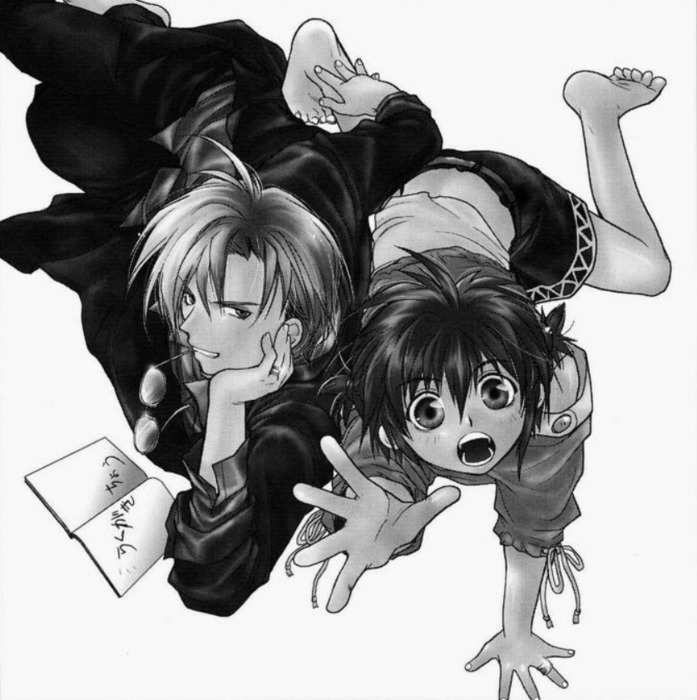 Что ж, осталось посмотреть аниме. Говорят, оттуда убрали весь дурдом, оставили только истерику Шуичи и основную сюжетную драму, так что приготовлюсь теперь рыдать по-настоящему, а не от смеха и ужаса. "Гравитация" чудесная комедия, да, больше всего комедия, но и развитие отношений тут очень страшно радует. Там есть и тян, и куны, на типичный сёнэн-ай вообще как-то мало похоже. Так что это было свежо и мозговыносно. Рекомендую, но не за один присест - пожалейте свою голову.