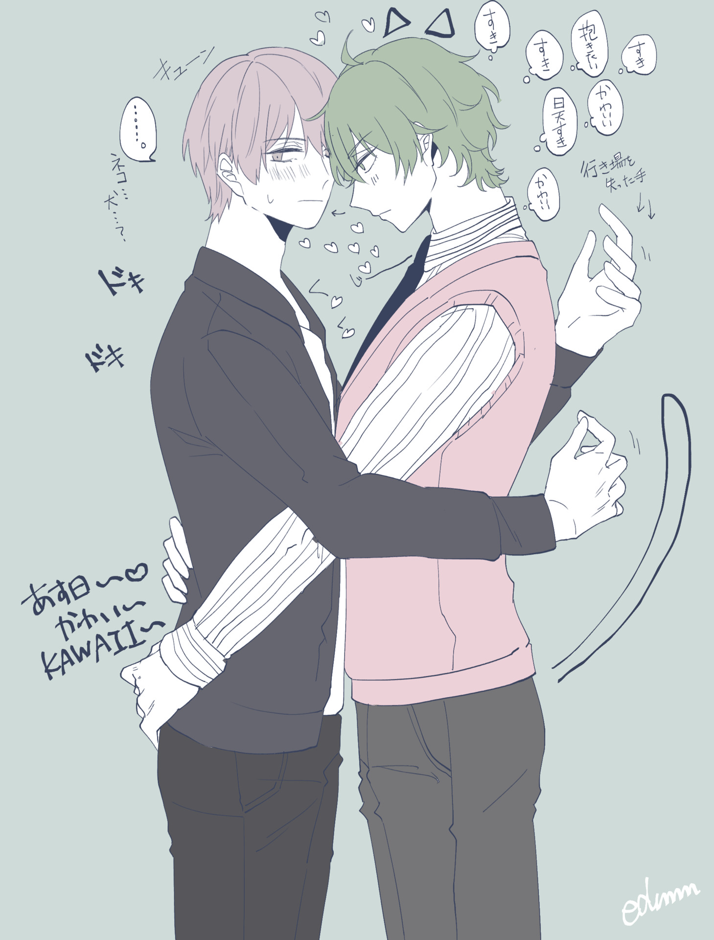 Судя по всему, многим очень зашёл Аск (зеленоволосый парень с битой). Но давайте воспользуемся моментом, чтобы оценить Коко на втором арте (´༎ຶོρ༎ຶོ`) и крипового Мио-сана Ааа, и арт, где Коко и Хисора счастливы... т-т Я уже говорила, что мне очень нравятся их зелёные накидки? Мммммммммм. Я СКУЧАЛА. Это может звучать странно, но когда я смотрю на картинки из Nie no Machi, чувствую определённый запах (погоды?) ._. Может, это просто ассоциации... Пусть новелла сама по себе и не была шикарной, мне кажется, она слишком запала мне в душу, ещё даже до того, как успела выйти Х) Это была любовь с первого просмотра опенинга Х)) Ещё тогда думала, что новелла выйдет средней... но не могла выкинуть её из головы и всё невольно ждала её выхода, чтобы лично проверить, насколько "средней" она может быть))