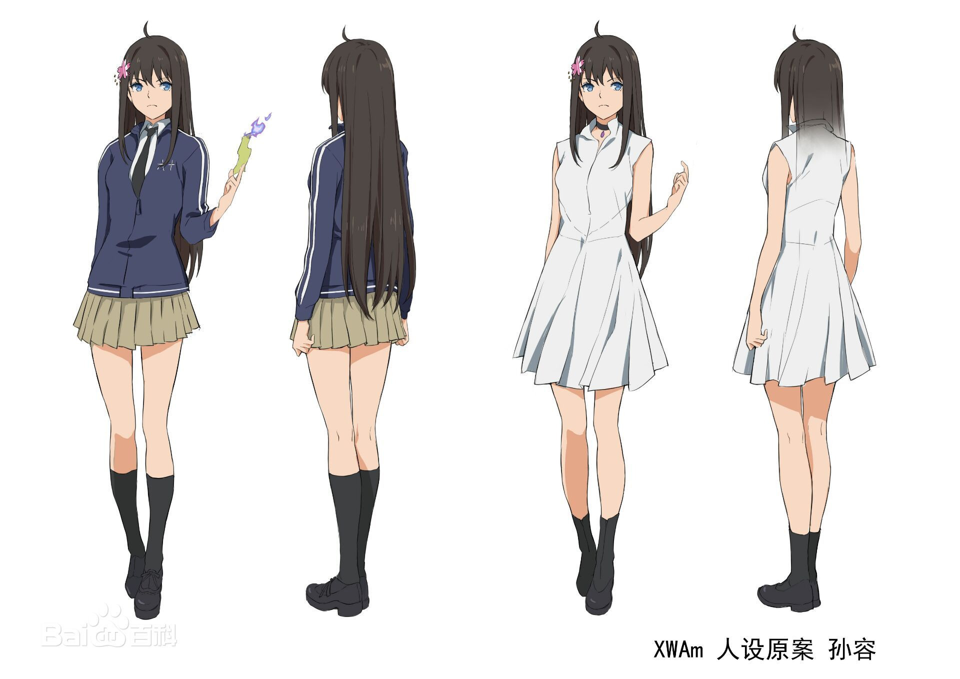 Описание: Красивая и симпатичная, с хорошей фигурой, черными волосами и голубыми зрачками. Всегда носит розовый аксессуар для волос в виде цветов вишни, который она иногда использует, чтобы завязать волосы в высокий хвост. За исключением школьной формы, она всегда носит белое платье с воротником и фиолетовое ожерелье из драгоценных камней в своей личной одежде.