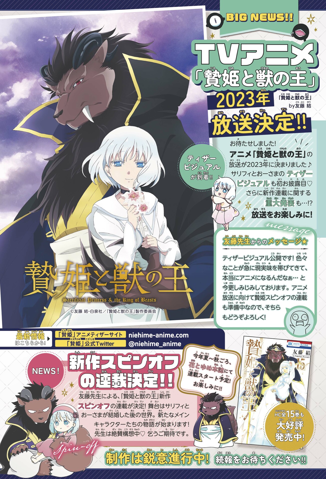 Официальный сайт аниме «Принесённая в жертву Принцесса и Царь зверей» опубликовал новый трейлер, постер, представил нового актера и раскрыл музыкальные темы сериала. Трансляция начнется в апреле этого года.