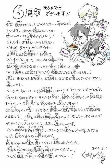 Оригинальная манга тем временем празднует своё шестилетие, в честь чего выпустили специальные иллюстрации.